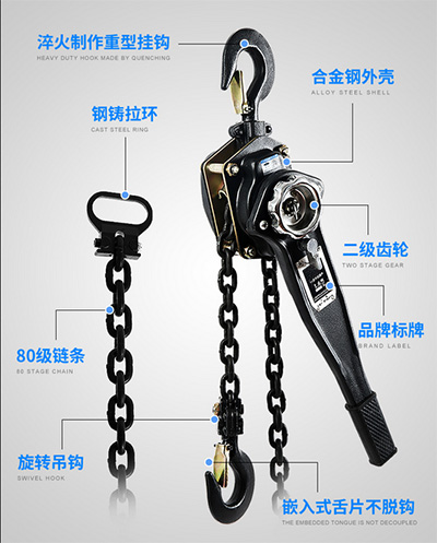 手板力小,堅固耐用,工作省力,扎實做工。高強度韌性,加厚鋁合金吊鉤,安全不劃扣,整體式螺母,使用壽命長,合理設(shè)計卡槽,操作簡單,人體工程學(xué)設(shè)計。結(jié)構(gòu):淬火制作重型掛鉤、合金鋼外殼、鋼鑄拉環(huán)、二級齒輪、80級鏈條、旋轉(zhuǎn)吊鉤、嵌入式舌片不脫鉤。
