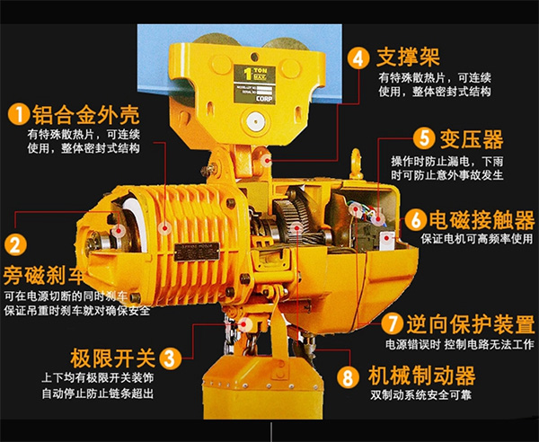 1、極限開關:吊上吊下都有極限開關裝置,到達極限自動停止,防止鏈條超出。