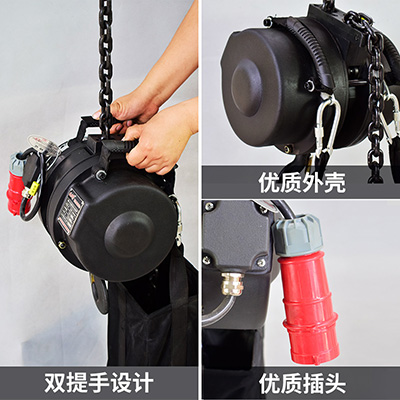 單鏈一噸速度2M/min,圓形對稱結構,專門防雨淋設計,摩擦式過重保護,整體式鋼制導鏈罩,沖頂及環鏈打結保護,36V間接式控制方式安全便捷。優質外殼,堅固耐用,G80級錳鋼鏈條,高效強韌,優質插頭,安心使用;舞臺專用倒掛葫蘆,表面黑漆處理,光亮持久;