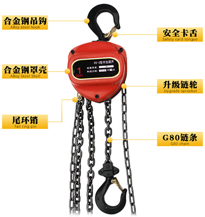 HS-C型手拉葫蘆主要機件選用鋼材制造,鏈條采用800Mpa 高強度起重鏈條,高強度足料吊鉤,合金材料。HS-C型手拉葫蘆在設計與使用性能上具有以下特點:經久耐用,性能好、維修簡便,體積小、重量輕、攜帶方便,手扳力小、效率高,結構先進、外觀美觀。